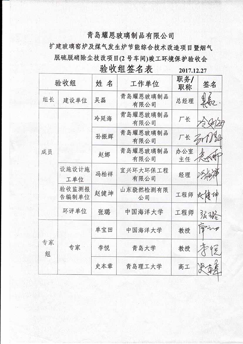 青島耀恩玻璃制品有限公司驗收組簽名